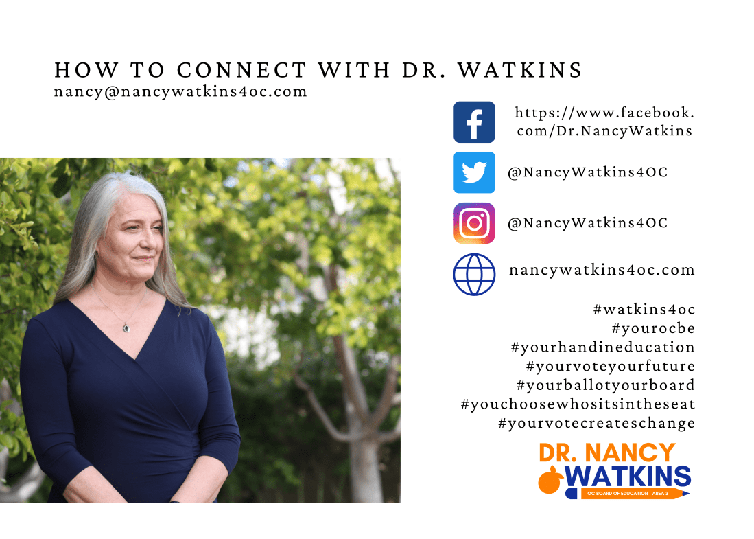 Nancy Watkins is an extraordinary educator who has dedicated her life to improving public schools for everyone. I have had the privilege of knowing Nancy as a colleague, mentor, administrator, and friend for the last twenty years. No one is more qualified to serve on the Orange County Board of Education (OCBE). No one is … Continue reading Nancy Watkins for OCBE