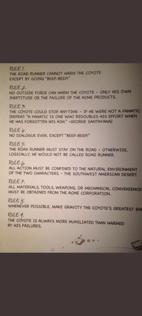 Chuck Jones created the brilliant Looney Tunes series, “The Road Runner.” The 9 rules that guided the cartoon express a moral gravity worth considering. Rule 3 seems particularly relevant to our time!